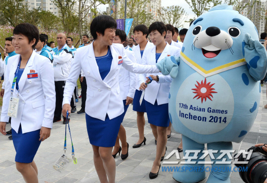 인천 아시안게임 북한 대표팀이 18일 인천 구월동 아시아드 선수촌 국기광장에서 선수촌 입촌식 행사를 가졌다. 국기광장으로 향하던 북한 선수들이 마스코트의 인사에 즐거워하고 있다.