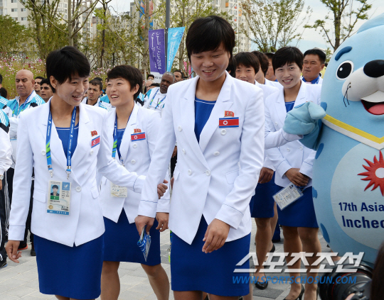 인천 아시안게임 북한 대표팀이 18일 인천 구월동 아시아드 선수촌 국기광장에서 선수촌 입촌식 행사를 가졌다. 국기광장으로 향하던 북한 선수들이 마스코트의 인사에 즐거워하고 있다.