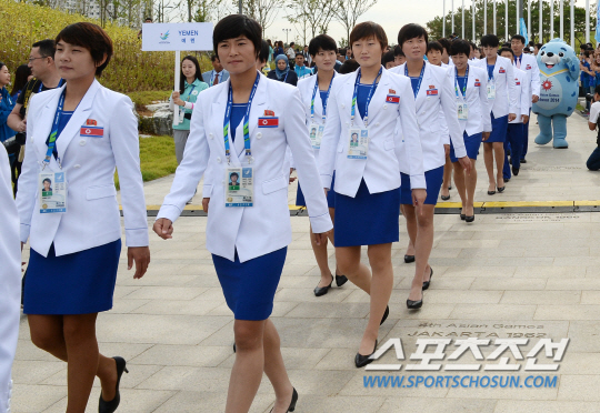 인천 아시안게임 북한 대표팀이 18일 인천 구월동 아시아드 선수촌 국기광장에서 선수촌 입촌식 행사를 가졌다. 북한 선수단이 국기광장으로 향하고 있다.