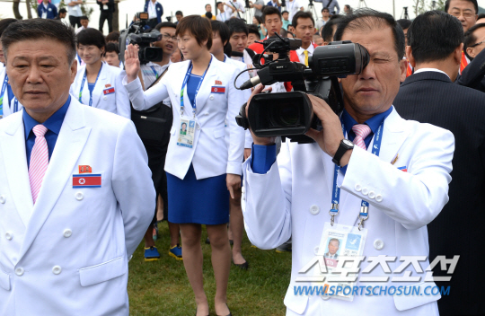 인천 아시안게임 북한 대표팀이 18일 인천 구월동 아시아드 선수촌 국기광장에서 선수촌 입촌식 행사를 가졌다. 북한 선수단과 함께 온 카메라 기자가 한국 취재진을 모습을 찍고 있다.
