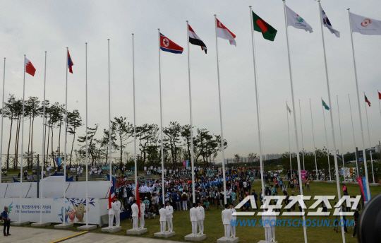 인천 아시안게임 북한 대표팀이 18일 인천 구월동 아시아드 선수촌 국기광장에서 선수촌 입촌식 행사를 가졌다. 북한 선수단의 국기가 게양되고 있다.