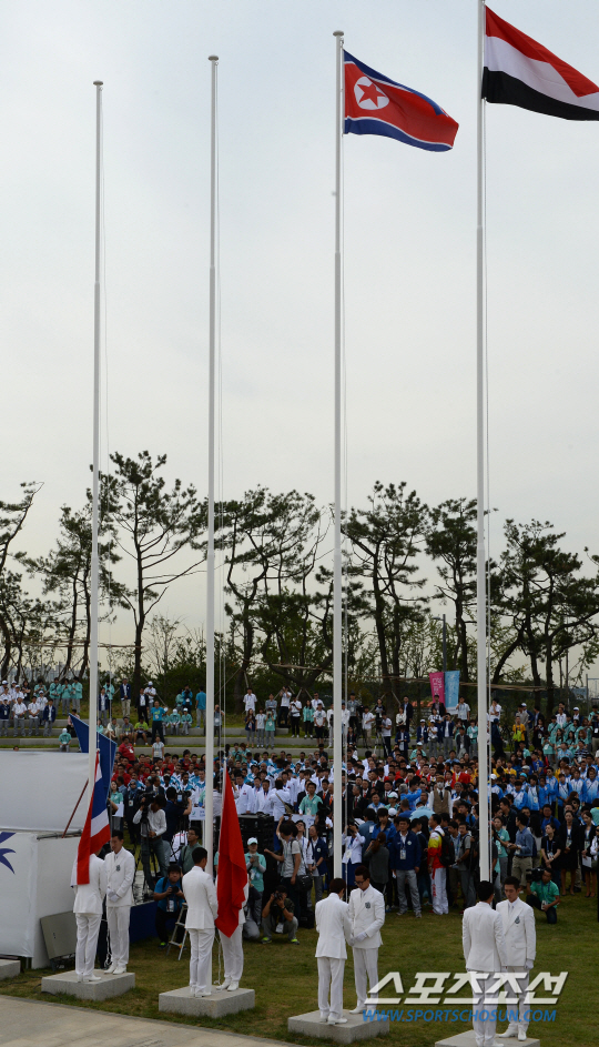 인천 아시안게임 북한 대표팀이 18일 인천 구월동 아시아드 선수촌 국기광장에서 선수촌 입촌식 행사를 가졌다. 북한 선수단의 국기가 게양되고 있다.
