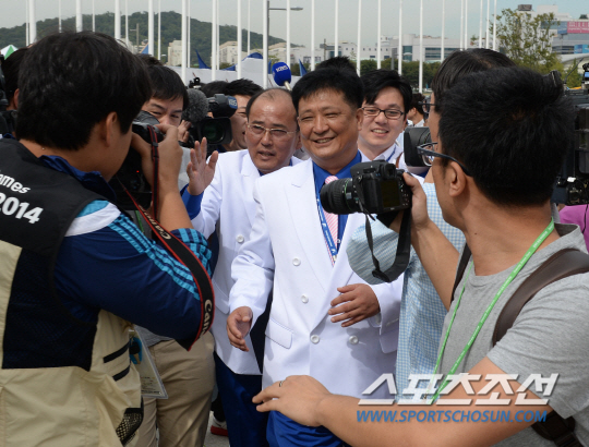 인천 아시안게임 북한 대표팀이 18일 인천 구월동 아시아드 선수촌 국기광장에서 선수촌 입촌식 행사를 가졌다. 북한 선수단이 입촌식 행사를 마친 가운데 김병식 북한선수단장이 한국 취재진의 인터뷰 공세를 받고 있다.