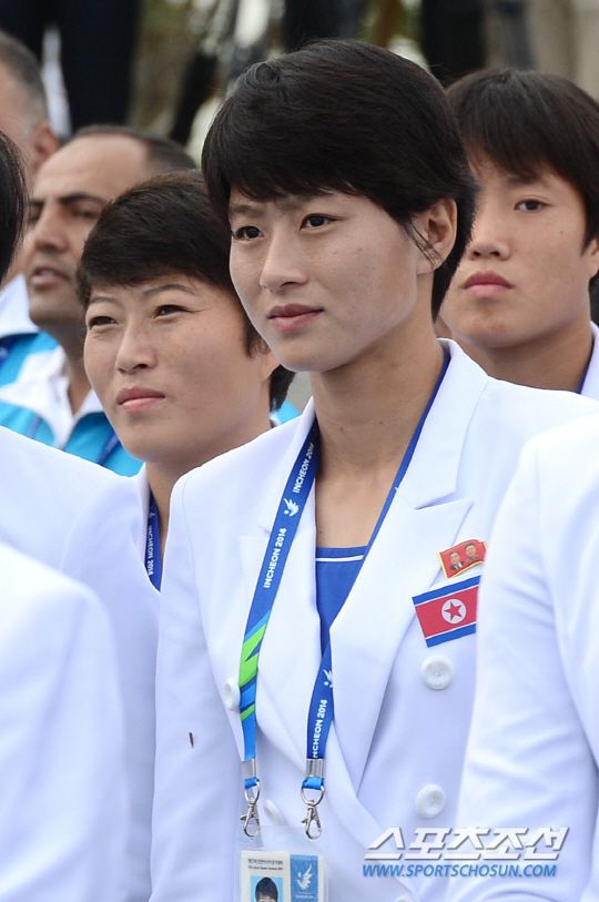 인천 아시안게임 북한 대표팀이 18일 인천 구월동 아시아드 선수촌 국기광장에서 선수촌 입촌식 행사를 가졌다. 북한 여자축구 대표팀 김은향이 입촌식 행사에 참여하고 있다.