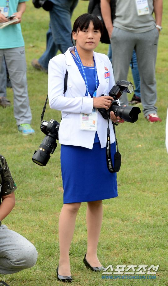 인천 아시안게임 북한 대표팀이 18일 인천 구월동 아시아드 선수촌 국기광장에서 선수촌 입촌식 행사를 가졌다. 북한 선수단과 동행한 북한 여자 사진기자가 행사를 취재하고 있다.