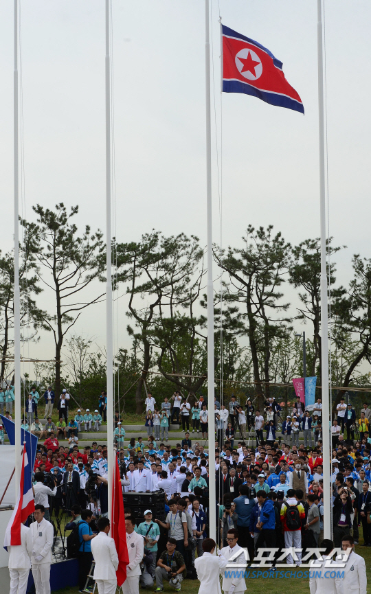 인천 아시안게임 북한 대표팀이 18일 인천 구월동 아시아드 선수촌 국기광장에서 선수촌 입촌식 행사를 가졌다. 북한 국가가 연주되는 가운데 인공기가 게양되고 있다.