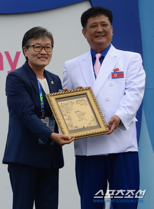 인천 아시안게임 북한 대표팀이 18일 인천 구월동 아시아드 선수촌 국기광장에서 선수촌 입촌식 행사를 가졌다. 김병식 북한 선수단장이 이애리사 선수촌장에게 '김홍도의 씨름'이 그려진 액자를 선물하고 있다.