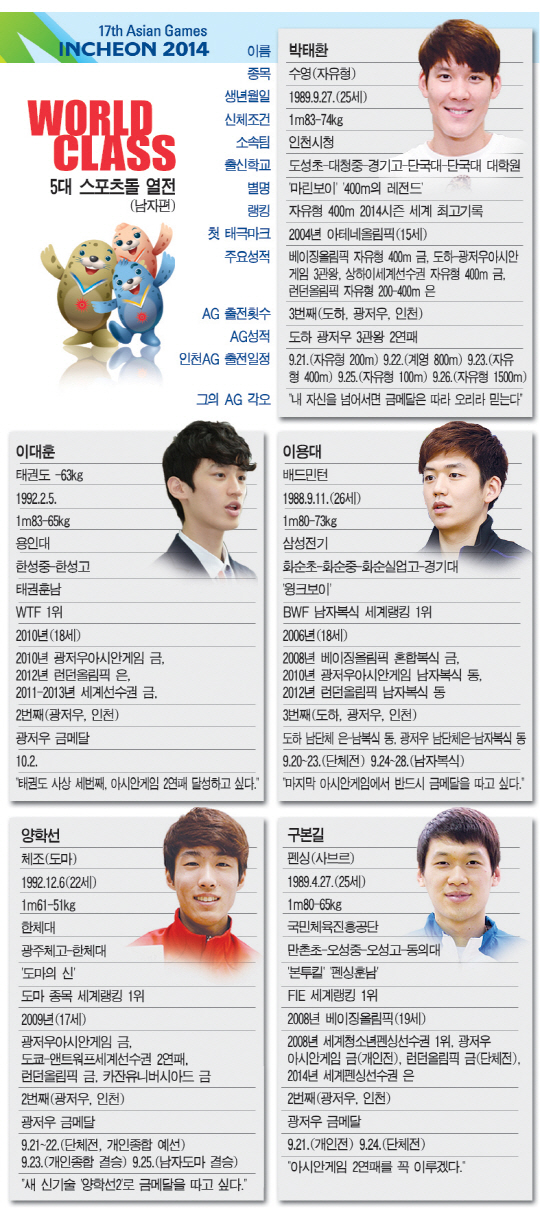'잘생겼다. 우월하다.' 19일 개막하는 인천아시안게임은 '월드클래스' 훈남들을 위한 축제다. 탁월한 실력에 훈훈한 외모, 매력적인 미소를 갖춘 '세계 1위' 에이스들에게 아시아는 좁다. 16일간(9월19일~10월4일)의 아시아 스포츠 축제, 인천 여심을 후끈 달굴 '대한민국 5대 스포츠돌', 남자편이다.