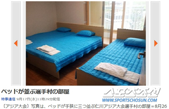 12일 인천아시안게임 선수촌에 입촌한 각국 선수단의 불만도 줄을 이었다. 일본 주요 언론들은 16일 '일본 남자 축구 대표팀 선수들이 선수촌 엘리베이터 고장으로 22층을 도보로 왕복했다'고 전했다. 미드필더 노쓰다 가쿠토는 TBS와의 인터뷰에서 "(22층까지 오르내리는 게) 솔직히 힘들었다"고 쓴웃음을 지었다. 이들 뿐만 아니라 타 동에 위치한 선수들도 엘리베이터 고장 문제로 곤욕을 치른 것으로 드러났다. 일본 남자 배구 대표팀의 고시카와 유우(JT)는 "엘리베이터가 움직이지 않아 17층까지 계단으로 올라갔다"고 푸념을 늘어놓았다.