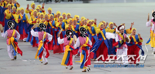 제17회 인천 아시안게임 개막식이 19일 인천아시아드주경기장에서 열렸다. 맞이행사로 인천의 문화유산 '부평풍물놀이'가 펼쳐지고 있다.