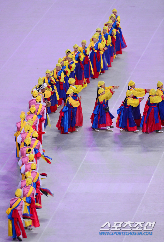 19일 오후 인천 아시아드 주경기장에서 제17회 인천아시아경기대회 개막식이 열렸다. 이번 인천 아시안게임은 아시아 45개국 25,000여 명의 선수단이 출전해 10월 4일 폐막까지 36개 종목에 걸쳐 실력을 겨루게 된다. 사진은 지난 17일 열린 개막식 리허설의 인천의 문화유산 '부평풍물놀이' 공연