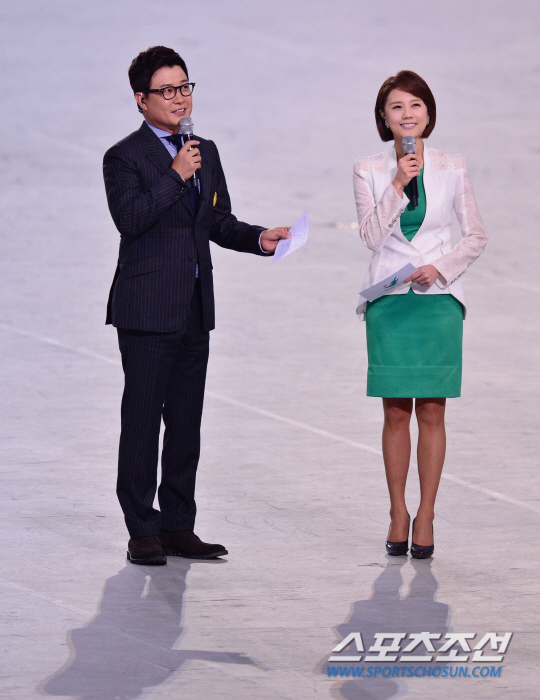 19일 인천 아시아드 주경기장에서 '45억 아시아인의 축제' 2014 인천아시안게임의 화려한 개회식이 열렸다. 개회식은 '45억의 꿈, 하나 되는 아시아'를 주제로 3시간 동안 화려한 대회 개막을 알렸다. K-팝 가수들의 공연과 한류 스타들의 축하 메시지 영상을 상영하는 맞이 행사를 시작으로 인천 아시안게임 홍보대사인 JYJ가 공식 주제가 '온리 원'(Olny One)을 부르고 피날레는 '월드스타' 싸이가 장식했다. 개막식에서 사회를 맡은 김성주-윤수영 아나운서가 인사말을 하고 있다.