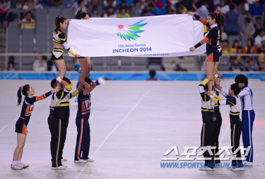 19일 인천 아시아드 주경기장에서 '45억 아시아인의 축제' 2014 인천아시안게임의 화려한 개회식이 열렸다. 개회식은 '45억의 꿈, 하나 되는 아시아'를 주제로 3시간 동안 화려한 대회 개막을 알렸다. K-팝 가수들의 공연과 한류 스타들의 축하 메시지 영상을 상영하는 맞이 행사를 시작으로 인천 아시안게임 홍보대사인 JYJ가 공식 주제가 '온리 원'(Olny One)을 부르고 피날레는 '월드스타' 싸이가 장식했다. 개막식에서 아크로바틱팀이 공연을 펼치고 있다.