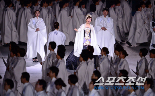 19일 인천 아시아드 주경기장에서 '45억 아시아인의 축제' 2014 인천아시안게임의 화려한 개회식이 열렸다. 개회식은 '45억의 꿈, 하나 되는 아시아'를 주제로 3시간 동안 화려한 대회 개막을 알렸다. K-팝 가수들의 공연과 한류 스타들의 축하 메시지 영상을 상영하는 맞이 행사를 시작으로 인천 아시안게임 홍보대사인 JYJ가 공식 주제가 '온리 원'(Olny One)을 부르고 피날레는 '월드스타' 싸이가 장식했다. 개막식에서 성악가 조수미가 공연을 펼치고 있다.