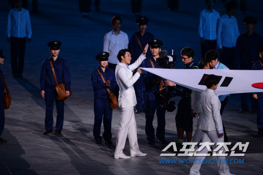 19일 인천 아시아드 주경기장에서 '45억 아시아인의 축제' 2014 인천아시안게임의 화려한 개회식이 열렸다. 개회식은 '45억의 꿈, 하나 되는 아시아'를 주제로 3시간 동안 화려한 대회 개막을 알렸다. K-팝 가수들의 공연과 한류 스타들의 축하 메시지 영상을 상영하는 맞이 행사를 시작으로 인천 아시안게임 홍보대사인 JYJ가 공식 주제가 '온리 원'(Olny One)을 부르고 피날레는 '월드스타' 싸이가 장식했다. 배우 현빈이 태극기와 함께 입장하고 있다.