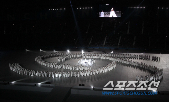 '45억의 꿈, 하나 되는 아시아'를 주제로 19일 인천아시아드주경기장에서 펼쳐지는 2014 인천 아시안게임 개회식이 19일 인천 아시아드 주경기장에서 열렸다. 고은 시인의 헌시인 '아시아드의 노래'에 곡을 붙인 노래를 성악가 조수미씨와 919명의 인천시민들이 열창하고 있다.