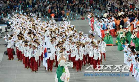 '45억의 꿈, 하나 되는 아시아'를 주제로 19일 인천아시아드주경기장에서 펼쳐지는 2014 인천 아시안게임 개회식이 19일 인천 아시아드 주경기장에서 열렸다. 한국 선수단이 마지막으로 입장하며 관중들의 환호에 답하고 있다.