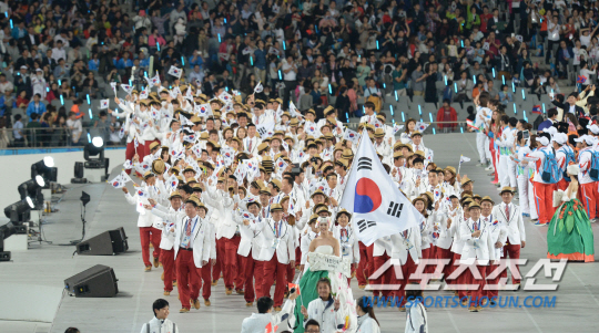 '45억의 꿈, 하나 되는 아시아'를 주제로 19일 인천아시아드주경기장에서 펼쳐지는 2014 인천 아시안게임 개회식이 19일 인천 아시아드 주경기장에서 열렸다. 한국 선수단이 마지막으로 입장하며 관중들의 환호에 답하고 있다.