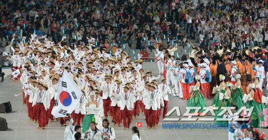 '45억의 꿈, 하나 되는 아시아'를 주제로 19일 인천아시아드주경기장에서 펼쳐지는 2014 인천 아시안게임 개회식이 19일 인천 아시아드 주경기장에서 열렸다. 한국 선수단이 마지막으로 입장하며 관중들의 환호에 답하고 있다.