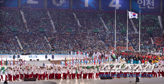 19일 인천 아시아드 주경기장에서 '45억 아시아인의 축제' 2014 인천아시안게임의 화려한 개회식이 열렸다. 개회식은 '45억의 꿈, 하나 되는 아시아'를 주제로 3시간 동안 화려한 대회 개막을 알렸다. K-팝 가수들의 공연과 한류 스타들의 축하 메시지 영상을 상영하는 맞이 행사를 시작으로 인천 아시안게임 홍보대사인 JYJ가 공식 주제가 '온리 원'(Olny One)을 부르고 피날레는 '월드스타' 싸이가 장식했다. 개막식에서 한국 선수단이 입장하고 있다.