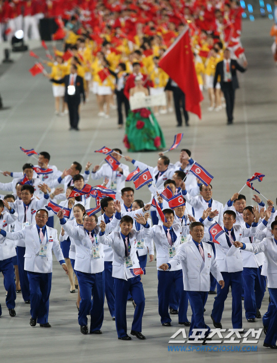 '45억의 꿈, 하나 되는 아시아'를 주제로 펼쳐지는 2014 인천 아시안게임 개회식이 19일 인천 아시아드 주경기장에서 열렸다. 조선민주주의인민공화국 선수단이 30번째로 입장하며 관중들의 환호에 답하고 있다.2014 인천 아시안게임의 개막식은 '아시아의 미래를 만나자'라는 주제로 임권택 감독이 총감독을 맡았고 장진 감독의 연출로 45억 아시아인이 하나로 모여 즐길 수 있는 자리로 마련됐다. 2014