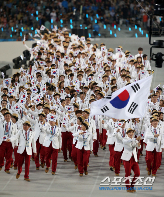 '45억의 꿈, 하나 되는 아시아'를 주제로 펼쳐지는 2014 인천 아시안게임 개회식이 19일 인천 아시아드 주경기장에서 열렸다. 한국 선수단이 마지막으로 입장하며 관중들의 환호에 답하고 있다.2014 인천 아시안게임의 개막식은 '아시아의 미래를 만나자'라는 주제로 임권택 감독이 총감독을맡았고 장진 감독의 연출로 45억 아시아인이 하나로 모여 즐길 수 있는 자리로 마련됐다. 2014