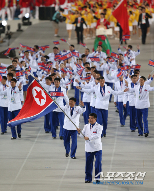 '45억의 꿈, 하나 되는 아시아'를 주제로 펼쳐지는 2014 인천 아시안게임 개회식이 19일 인천 아시아드 주경기장에서 열렸다. 조선민주주의인민공화국 선수단이 30번째로 입장하며 관중들의 환호에 답하고 있다.2014 인천 아시안게임의 개막식은 '아시아의 미래를 만나자'라는 주제로 임권택 감독이 총감독을 맡았고 장진 감독의 연출로 45억 아시아인이 하나로 모여 즐길 수 있는 자리로 마련됐다. 2014