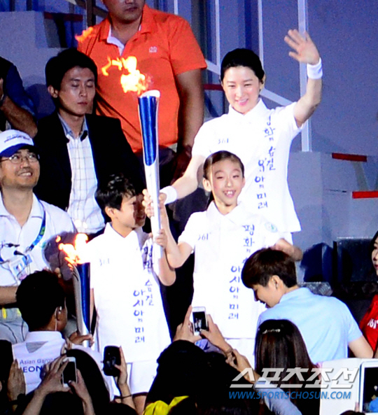 19일 인천 아시아드 주경기장에서 '45억 아시아인의 축제' 2014 인천아시안게임의 화려한 개회식이 열렸다. 개회식은 '45억의 꿈, 하나 되는 아시아'를 주제로 3시간 동안 화려한 대회 개막을 알렸다. K-팝 가수들의 공연과 한류 스타들의 축하 메시지 영상을 상영하는 맞이 행사를 시작으로 인천 아시안게임 홍보대사인 JYJ가 공식 주제가 '온리 원'(Olny One)을 부르고 피날레는 '월드스타' 싸이가 장식했다. 개막식에서 성화 마지막 주자인 배우 이영애가 어린이들과 함께 성화를 들고 있다.