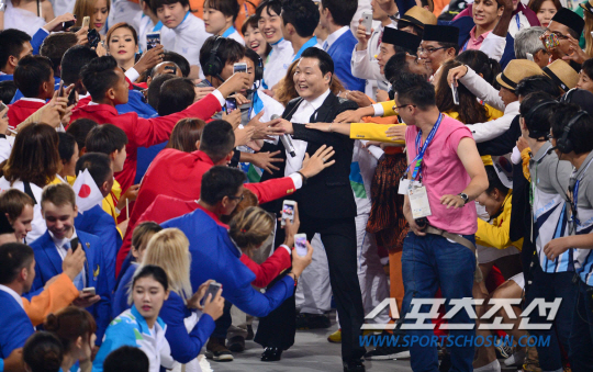 19일 인천 아시아드 주경기장에서 '45억 아시아인의 축제' 2014 인천아시안게임의 화려한 개회식이 열렸다. 개회식은 '45억의 꿈, 하나 되는 아시아'를 주제로 3시간 동안 화려한 대회 개막을 알렸다. K-팝 가수들의 공연과 한류 스타들의 축하 메시지 영상을 상영하는 맞이 행사를 시작으로 인천 아시안게임 홍보대사인 JYJ가 공식 주제가 '온리 원'(Olny One)을 부르고 피날레는 '월드스타' 싸이가 장식했다. 개막식에서 공연을 마친 싸이가 퇴장하고 있다.