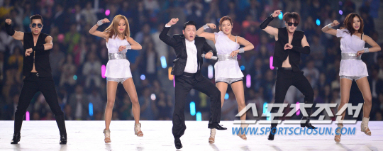 19일 인천 아시아드 주경기장에서 '45억 아시아인의 축제' 2014 인천아시안게임의 화려한 개회식이 열렸다. 개회식은 '45억의 꿈, 하나 되는 아시아'를 주제로 3시간 동안 화려한 대회 개막을 알렸다. K-팝 가수들의 공연과 한류 스타들의 축하 메시지 영상을 상영하는 맞이 행사를 시작으로 인천 아시안게임 홍보대사인 JYJ가 공식 주제가 '온리 원'(Olny One)을 부르고 피날레는 '월드스타' 싸이가 장식했다. 개막식에서 가수 싸이가 공연을 하고 있다.