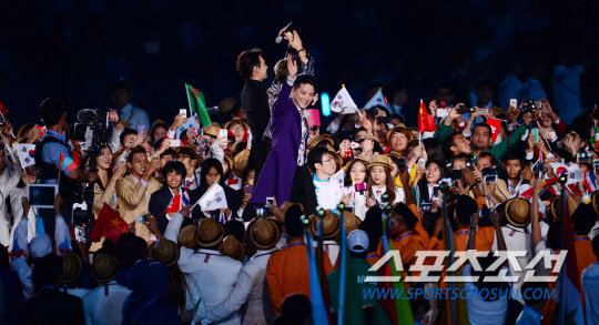 19일 인천 아시아드 주경기장에서 '45억 아시아인의 축제' 2014 인천아시안게임의 화려한 개회식이 열렸다. 개회식은 '45억의 꿈, 하나 되는 아시아'를 주제로 3시간 동안 화려한 대회 개막을 알렸다. K-팝 가수들의 공연과 한류 스타들의 축하 메시지 영상을 상영하는 맞이 행사를 시작으로 인천 아시안게임 홍보대사인 JYJ가 공식 주제가 '온리 원'(Olny One)을 부르고 피날레는 '월드스타' 싸이가 장식했다. 개막식에서 JYJ가 공연을 하고 있다.