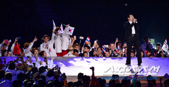 19일 인천 아시아드 주경기장에서 '45억 아시아인의 축제' 2014 인천아시안게임의 화려한 개회식이 열렸다. 개회식은 '45억의 꿈, 하나 되는 아시아'를 주제로 3시간 동안 화려한 대회 개막을 알렸다. K-팝 가수들의 공연과 한류 스타들의 축하 메시지 영상을 상영하는 맞이 행사를 시작으로 인천 아시안게임 홍보대사인 JYJ가 공식 주제가 '온리 원'(Olny One)을 부르고 피날레는 '월드스타' 싸이가 장식했다. 개막식에서 싸이가 공연을 하고 있다.