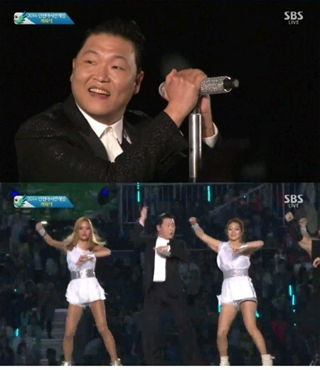 아시안게임 홍보대사인 JYJ에 이어 등장한 싸이는 피아니스트 랑랑과의 협연으로 '챔피언'을 열창했다.