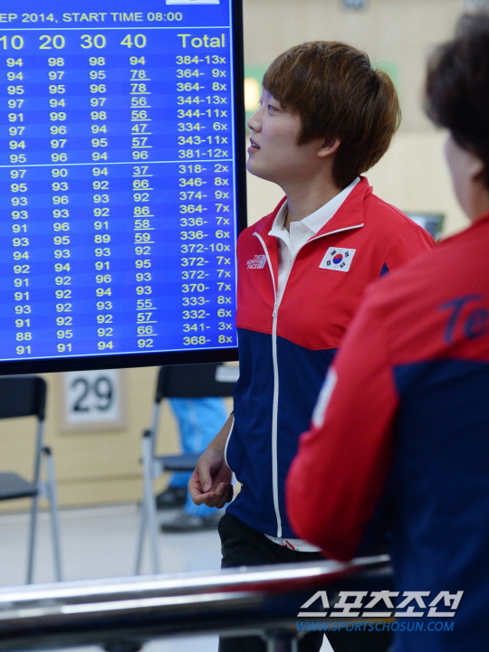 2014 인천아시안게임 사격 여자 10m 공기권총 본선이 20일 인천 옥련국제사격장에서 열렸다. 김장미가 본선경기를 마친 후 기록을 살펴보고 있다. 김장미는 1위로 결선에 진출했지만 한국은 단체전 4위를 기록하며 첫 메달획득은 불발됐다.