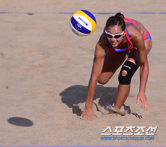 20일 오전 인천 송도글로벌대학 비치발리볼장에서 2014 인천 아시안게임 여자 비치발리볼 한국과 카자흐스탄의 경기가 열렸다. 한국 이은아가 카자흐스탄의 공격을 놓치고 있다.