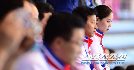 20일 오전 인천 문학박태환수영장에서 2014 인천 아시안게임 여자 싱크로나이즈드 스위밍 듀엣 규정종목 경기가 열렸다. 북한 싱크로나이즈 김은아가 경기를 관전하고 있다.