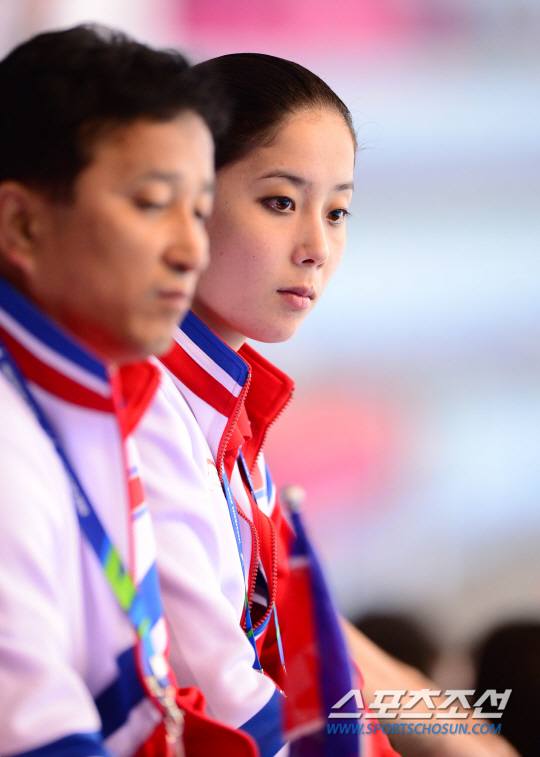 20일 오전 인천 문학박태환수영장에서 2014 인천 아시안게임 여자 싱크로나이즈드 스위밍 듀엣 규정종목 경기가 열렸다. 북한 싱크로나이즈 김은아가 경기를 관전하고 있다.