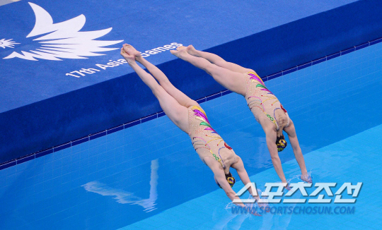 20일 오전 인천 문학박태환수영장에서 2014 인천 아시안게임 여자 싱크로나이즈드 스위밍 듀엣 규정종목 경기가 열렸다. 북한 싱크로나이즈 김종희와 리지향이 멋진 연기를 선보이고 있다.