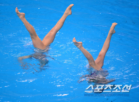 20일 오전 인천 문학박태환수영장에서 2014 인천 아시안게임 여자 싱크로나이즈드 스위밍 듀엣 규정종목 경기가 열렸다. 북한 싱크로나이즈 김종희와 리지향이 멋진 연기를 선보이고 있다.