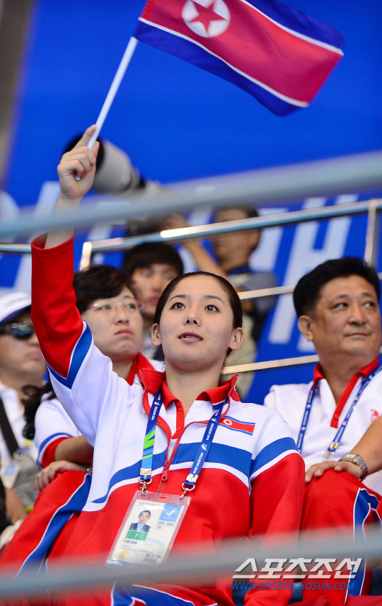 20일 오전 인천 문학박태환수영장에서 2014 인천 아시안게임 여자 싱크로나이즈드 스위밍 듀엣 규정종목 경기가 열렸다. 북한 싱크로나이즈 김은아가 김종희와 리지향이 입장하자 환호하고 있다.