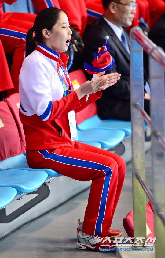 20일 오전 인천 문학박태환수영장에서 2014 인천 아시안게임 여자 싱크로나이즈드 스위밍 듀엣 규정종목 경기가 열렸다. 북한 싱크로나이즈 김은아가 김종희와 리지향이 입장하자 환호하고 있다.