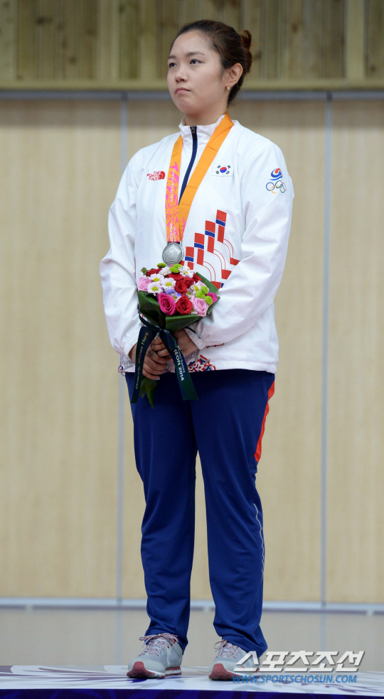 2014 인천아시안게임 사격 여자 10m 공기권총 결선이 20일 인천 옥련국제사격장에서 열렸다. 2위를 차지하며 은메달을 획득한 정지혜가 곧이어 열린 시상식에서 메달과 함께 시상대에 올라 국민의례를 하고 있다.