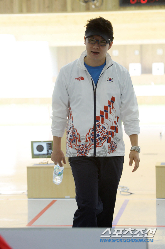 2014 인천아시안게임 사격 남자 50m 공기권총 결선이 20일 인천 옥련국제사격장에서 열렸다. 진종오가 결선에서 92.1점으로 7위를 기록하며 경기장을 빠져나오고 있다.