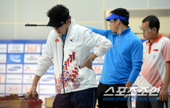 2014 인천아시안게임 사격 남자 50m 공기권총 결선이 20일 인천 옥련국제사격장에서 열렸다. 진종오가 결선경기에서 잘 풀리지 않는듯 아쉬운 표정을 짓고 있다. 진종오는 92.1점으로 7위를 기록하며 메달획득에 실패했다.