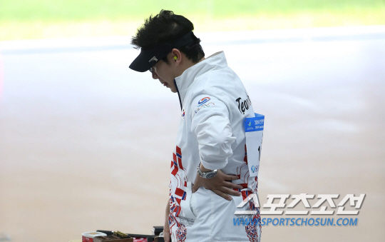 2014 인천아시안게임 사격 남자 50m 공기권총 결선이 20일 인천 옥련국제사격장에서 열렸다. 진종오가 결선에서 92.1점으로 7위를 기록하며 아쉬워하고 있다.