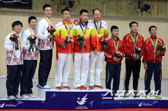 2014 인천아시안게임 사격 남자 50m 공기권총 결선이 20일 인천 옥련국제사격장에서 열렸다. 단체전 은메달을 획득한 진종오, 이대명, 최영래가 포즈를 취하고 있다.