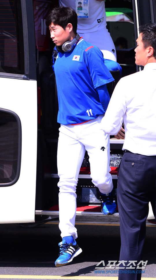 20일 오후 서울 목동야구장에서 2014 인천 아시안게임 한국 야구대표팀의 공식 훈련이 열렸다. 야구대표팀 이재학이 버스에서 내리고 있다.