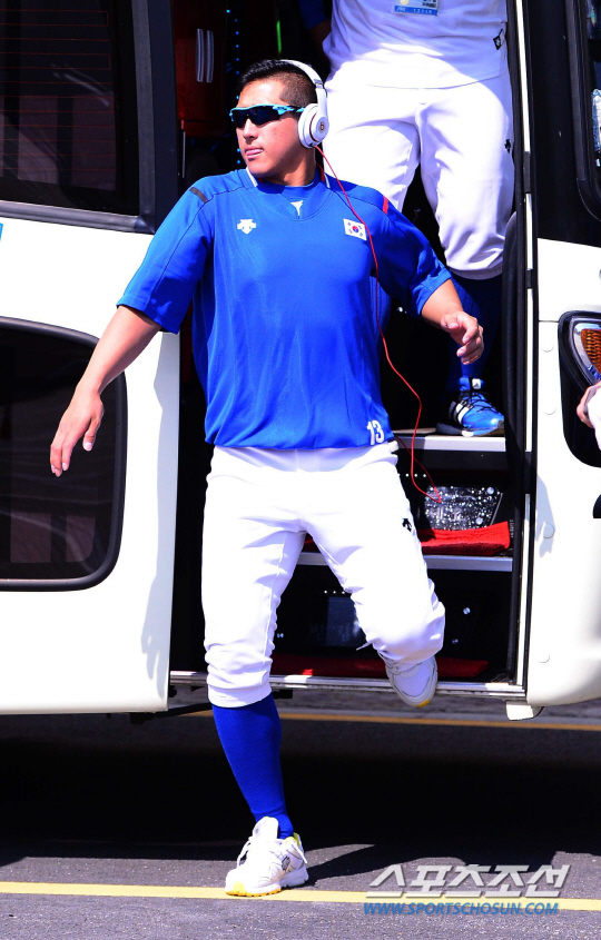 20일 오후 서울 목동야구장에서 2014 인천 아시안게임 한국 야구대표팀의 공식 훈련이 열렸다. 야구대표팀 황재균이 버스에서 내리고 있다.