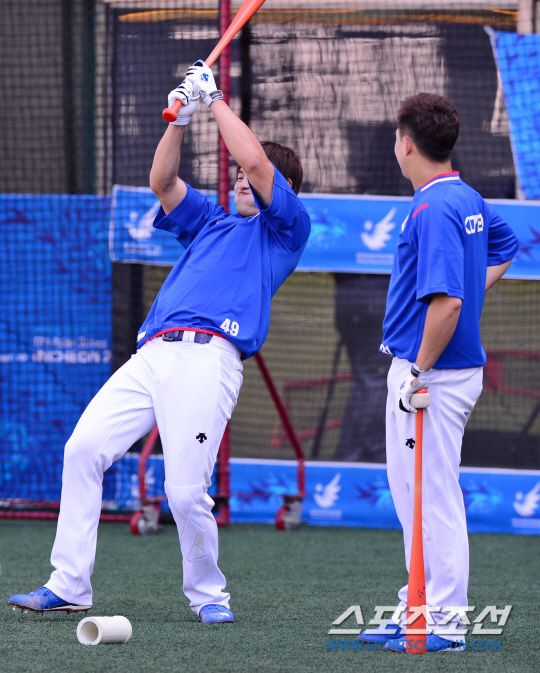 20일 오후 서울 목동야구장에서 2014 인천 아시안게임 한국 야구대표팀의 공식 훈련이 열렸다. 훈련 도중 민병헌(왼쪽)이 손아섭의 스윙 폼을 흉내내고 있다.