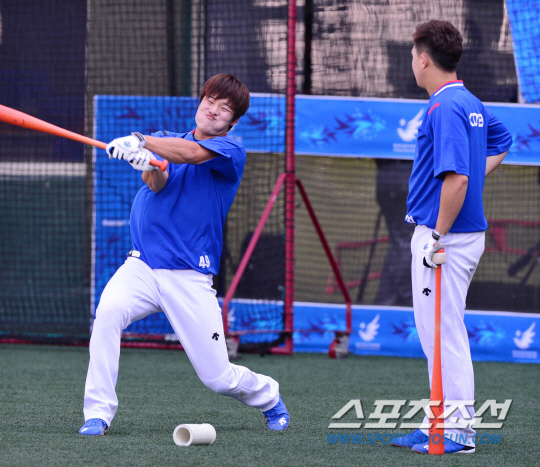 20일 오후 서울 목동야구장에서 2014 인천 아시안게임 한국 야구대표팀의 공식 훈련이 열렸다. 훈련 도중 민병헌(왼쪽)이 손아섭의 스윙 폼을 흉내내고 있다.